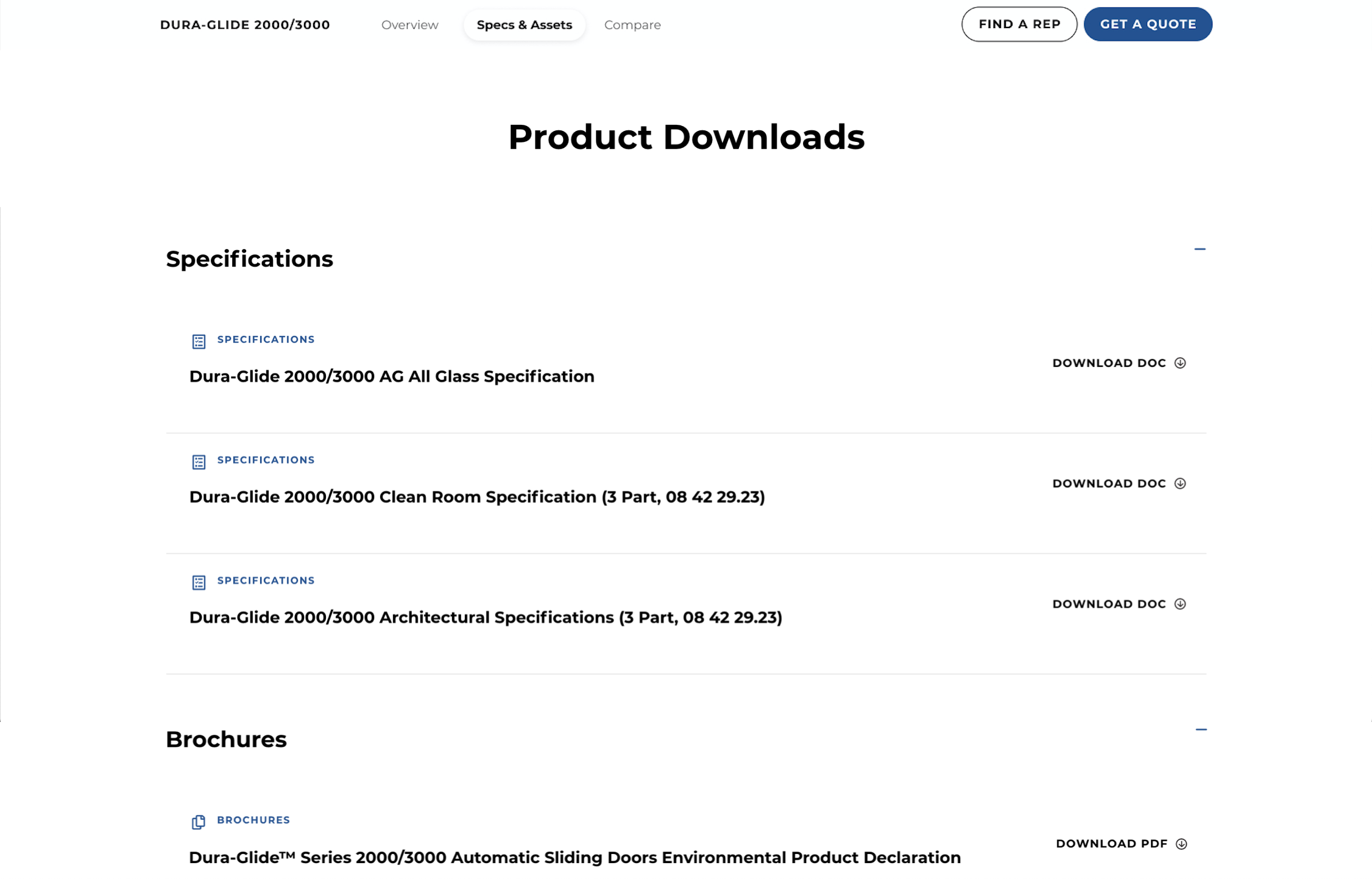While the old website was dense in information, what good was it if no one could find it? We sought to preserve the depth of information, but reorganize it in a way that was familiar to users and on par with modern UX/UI design. We aimed to reimagine how users could browse, compare, quote, and service doors. We wanted users to be more self-sufficient on the website, freeing staff up from handling the tedious phone calls they cited in all of our stakeholder interviews.