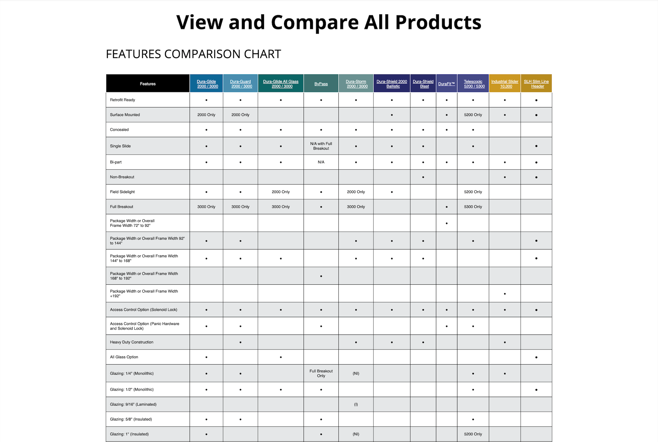 On the old site, comparison tables were standalone pages, but on the new site, product comparisons are now within a tab on Product Profile pages. This significantly helps users find the right product, because they are now able to see the differences between similar doors without leaving the product page they are already on.
